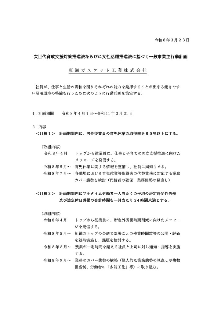 次世代育成支援対策推進法ならびに女性活躍推進法に基づく一般事業主行動計画 計画期間と内容につきましては下記画像をご参照ください 次世代育成支援対策推進法ならびに女性活躍推進法に基づく一般事業主行動計画(1/2) 次世代育成支援対策推進法ならびに女性活躍推進法に基づく一般事業主行動計画(2/2)