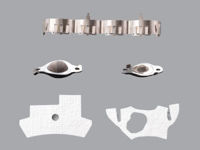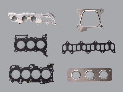 シリンダーヘッドやエキゾーストマニホールドなどに用いる積層ガスケットは打ち抜き加工したメタルガスケットをグロメット・スポット溶接・カシメといった工法を用いてアセンブリ加工します。